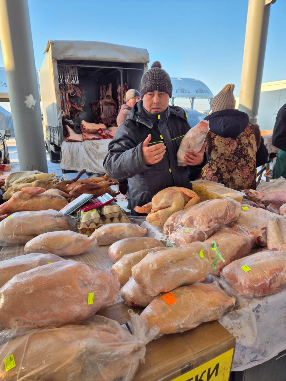 Торговые места были оформлены в новогодней тематике. Горожане активно закупали мясо говядины, свинины, уток, гусей; овощи; яйца и другую продукцию.