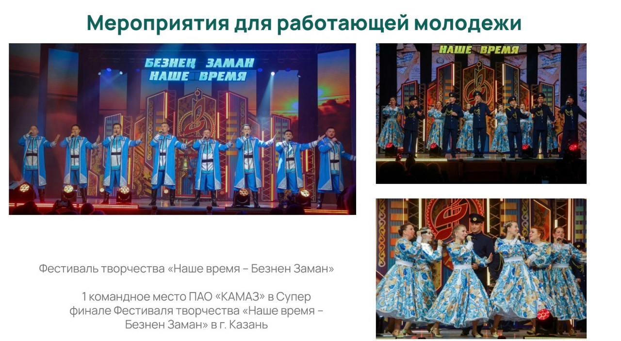 «Одним из ярких примеров распространения положительного опыта стала подготовка и участие в ежегодном открытом республиканском телевизионном фестивале творчества «Наше время-Безнең заман». Команда работающей молодежи ПАО «КАМАЗ» заняла первое место в суперфинале», – сообщила начальник управления по делам молодежи Лейсан Видинеева.