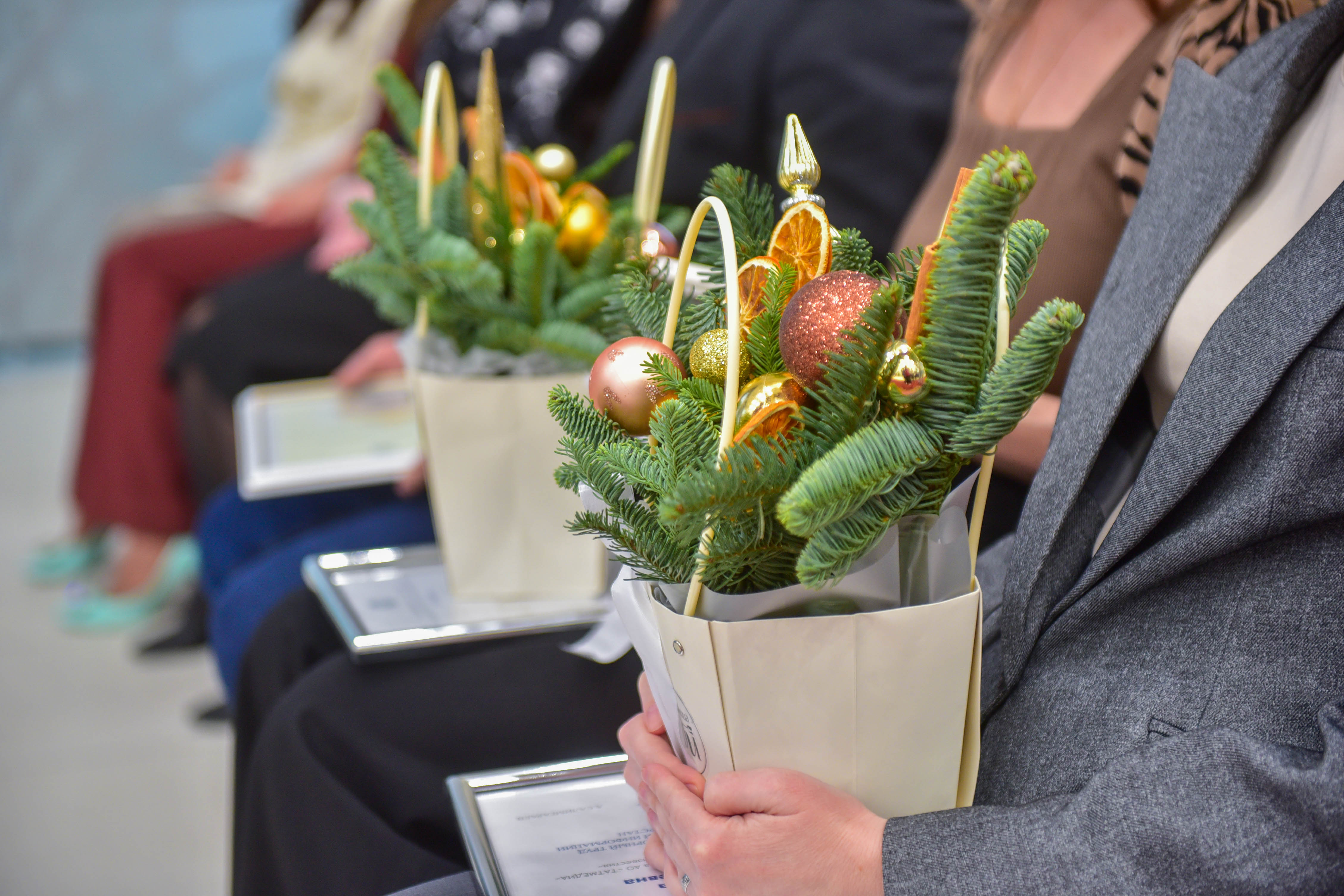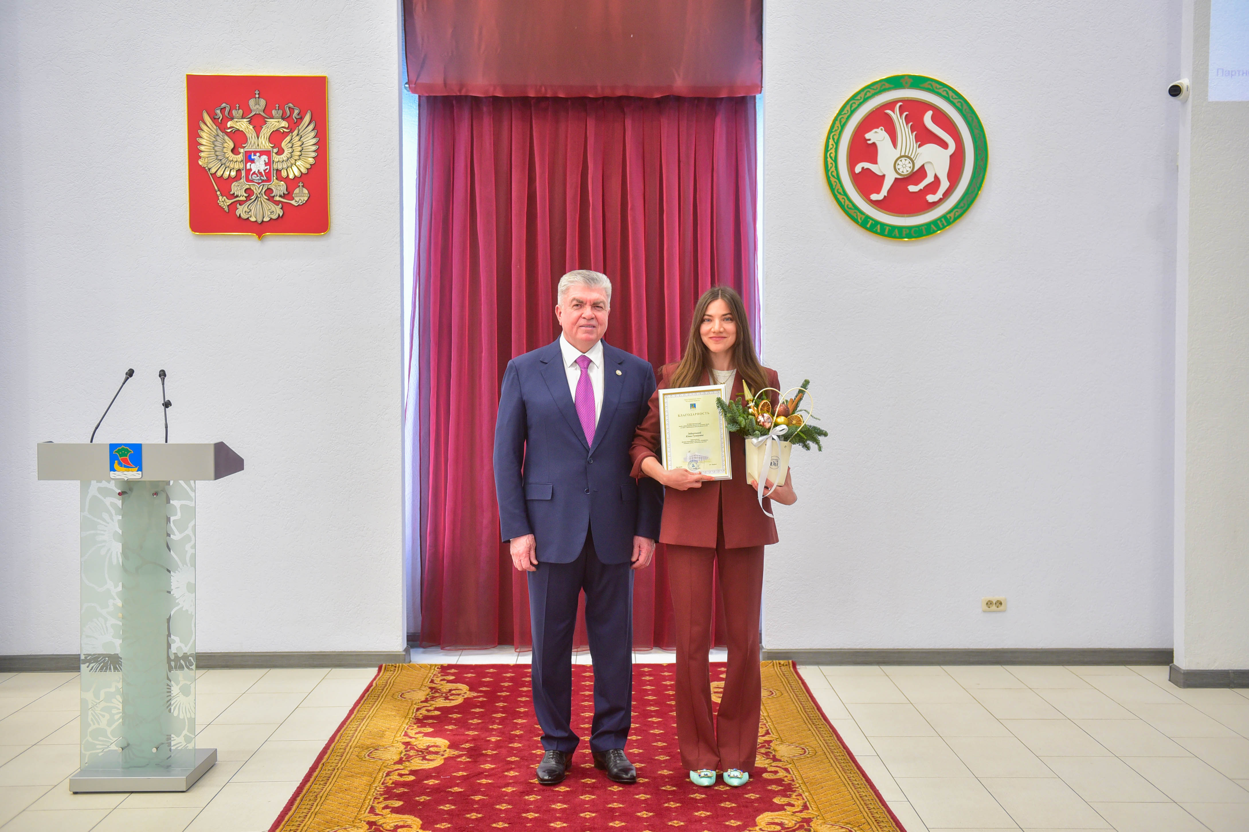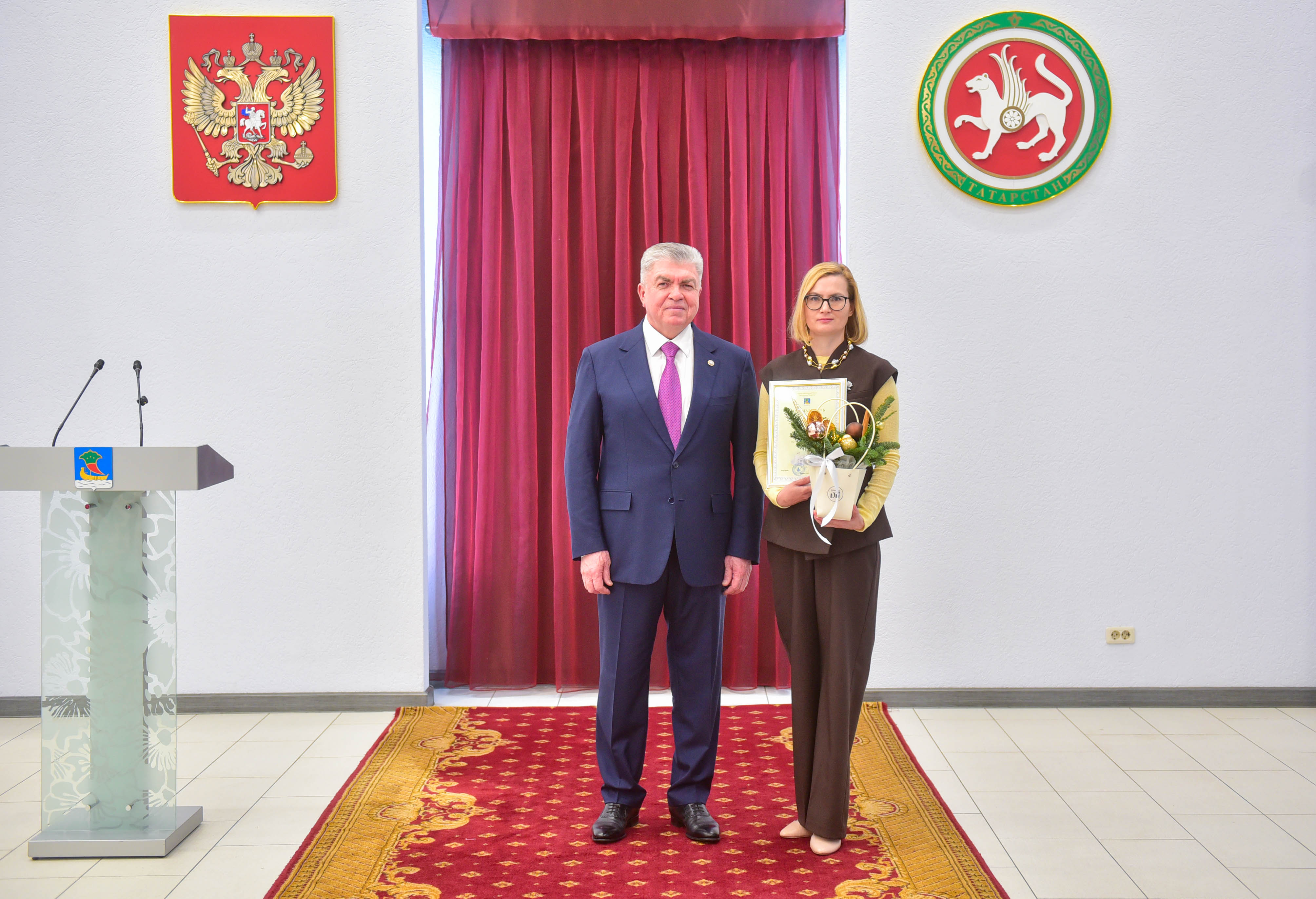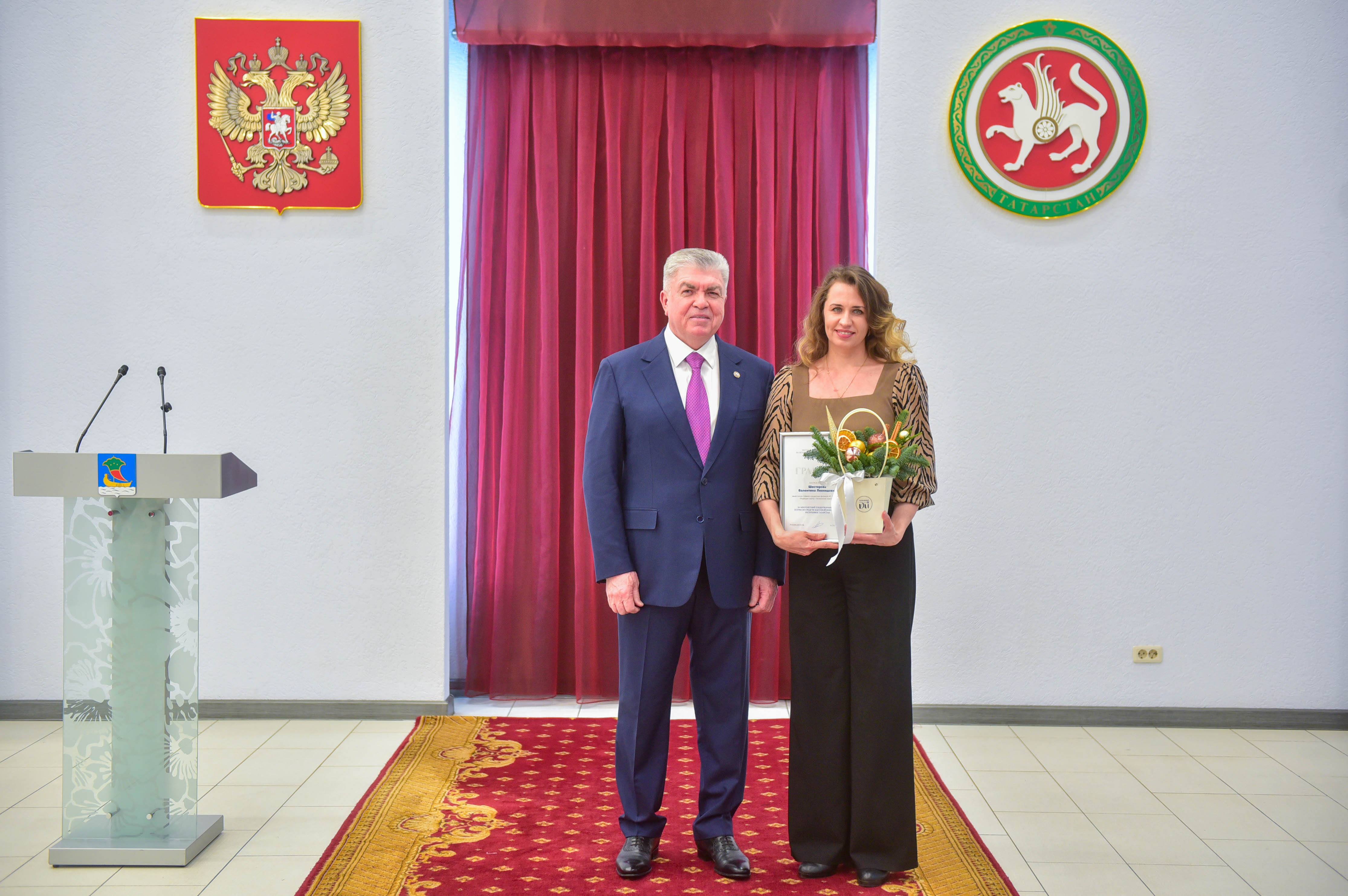 Награждаемым вручили продукцию, сделанную в Набережных Челнах: натуральную косметику Anvelian, сертификаты в магазин одежды «Клуб миллионеров» и цветы от магазина «Теплица Ди».
