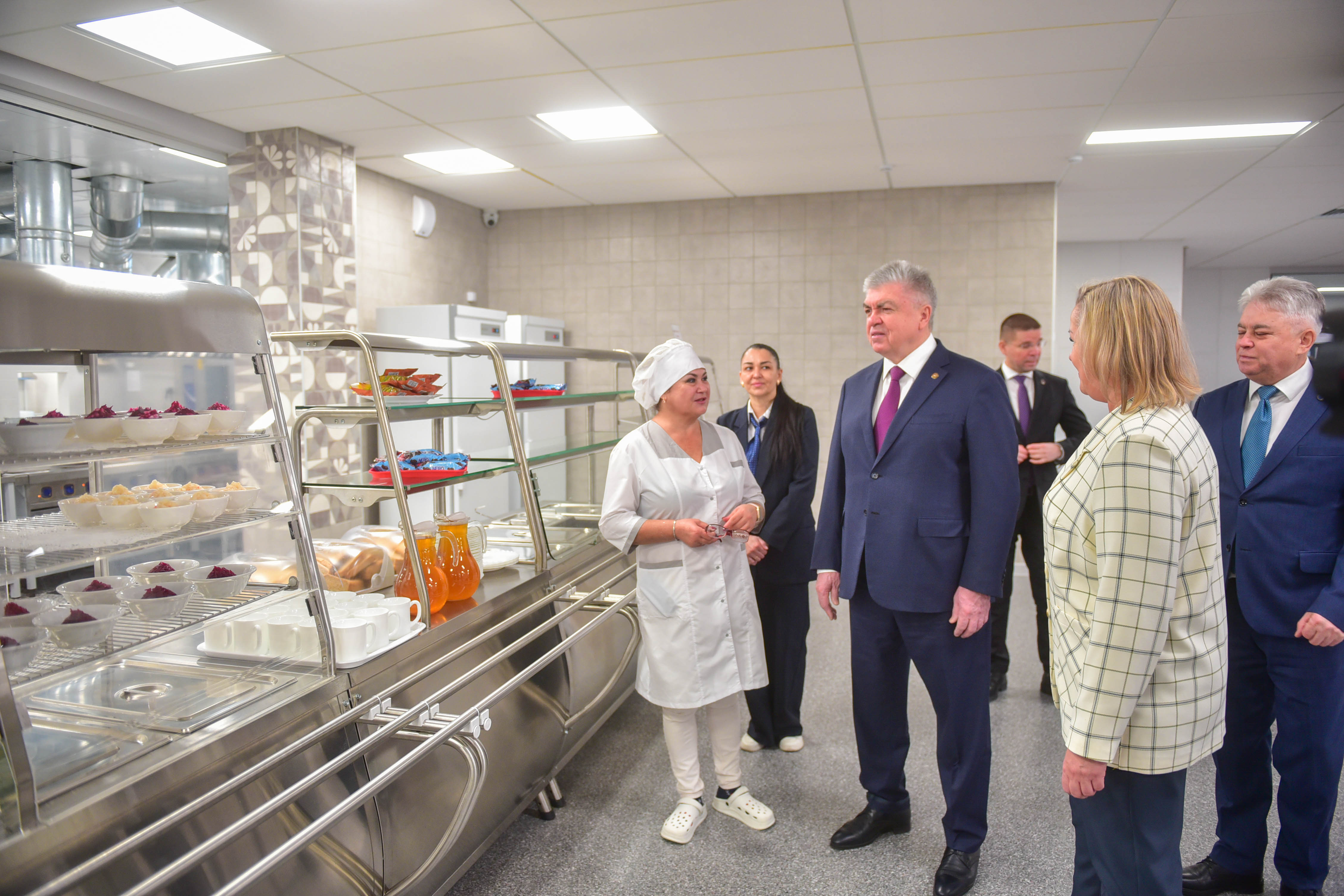 Следующая точка посещения – школьная столовая. Сегодня повара согласно меню от комбината "Школьное питание" приготовили картофельное пюре, свекольный салат, зеленую фасоль и компот. Второе питание в школе предусмотрено для 37 детей участников СВО, также бесплатно питаются 324 школьника из многодетных семей, 34 ребенка с ОВЗ, а также 40 детей сотрудников силовых ведомств (МВД, Росгвардии).