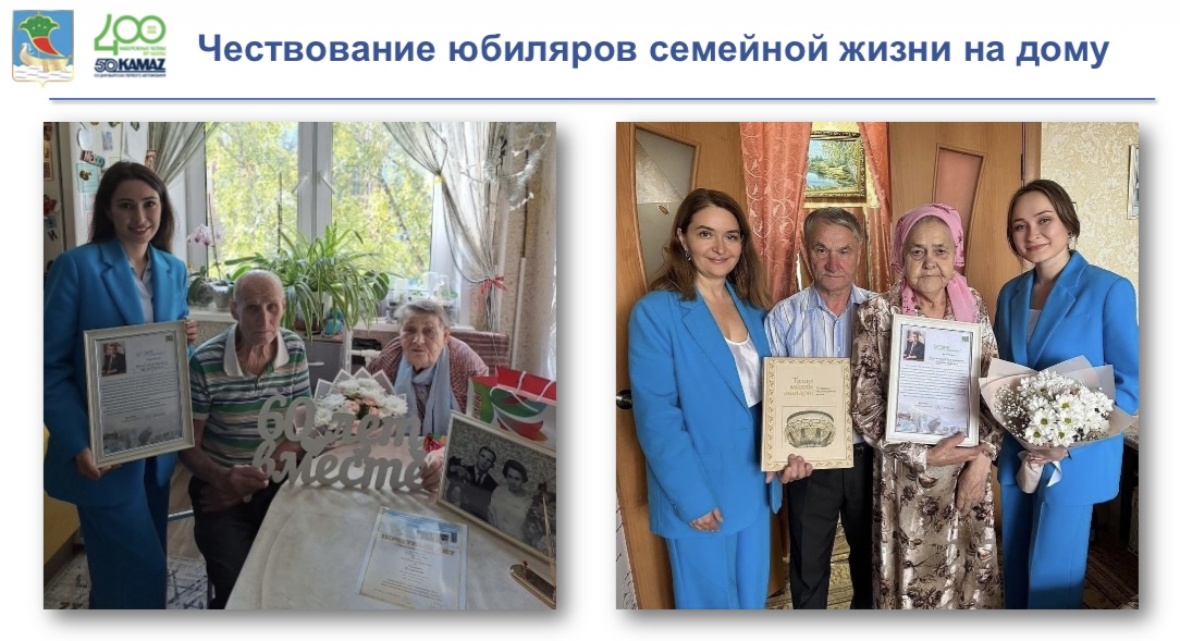 В 2025 году челнинский Дворец торжеств поздравил более 140 пар, отметивших серебряные, золотые и бриллиантовые свадьбы. Для юбиляров, которые не могут приехать, поздравления организуют на дому.