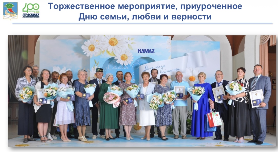 Особым событием стала «Семейная неделя», приуроченная ко Дню семьи, любви и верности. Ее кульминацией стала церемония в Органном зале, где медали «За любовь и верность» получили десять лучших семей города. Всего этой награды с 2009 года удостоены 123 семьи. На торжестве также чествовали трудовые династии ПАО «КАМАЗ».