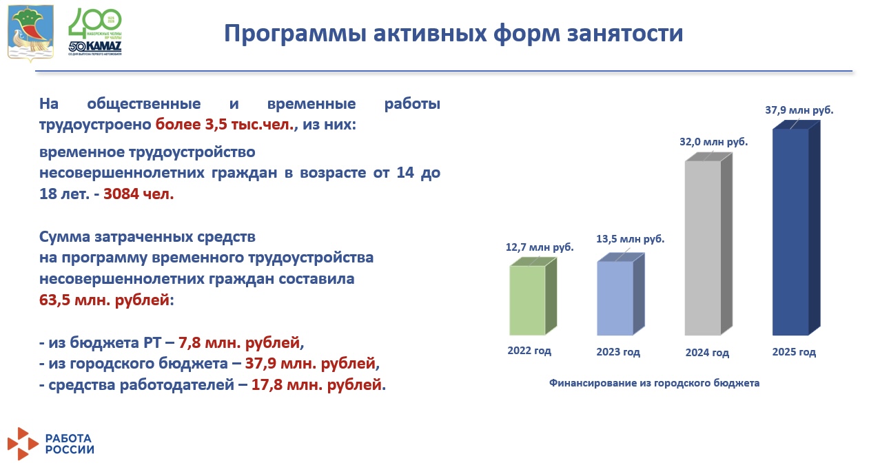 Общий объем финансирования мероприятий по временному трудоустройству в 2025 году составил 63,5 млн рублей. Данная сумма сформирована из средств городского бюджета в размере 37,9 млн рублей, вложений работодателей на сумму 17,8 млн рублей, а также субсидий из бюджета Республики Татарстан в размере 7,8 млн рублей. Финансирование из городской казны было увеличено в три раза по сравнению с 2022 годом, что позволило перевести подростковую занятость с двухчасового на четырехчасовой рабочий день и соответствующим образом повысить уровень оплаты труда участников.