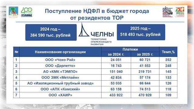 Особую роль сыграли резиденты территории опережающего развития (ТОР): от 50 резидентов поступило 519 млн рублей по НДФЛ (рост к 2024 году – 134 млн рублей); в консолидированный бюджет Республики Татарстан резиденты перечислили 1 млрд 887 млн рублей по этому налогу.