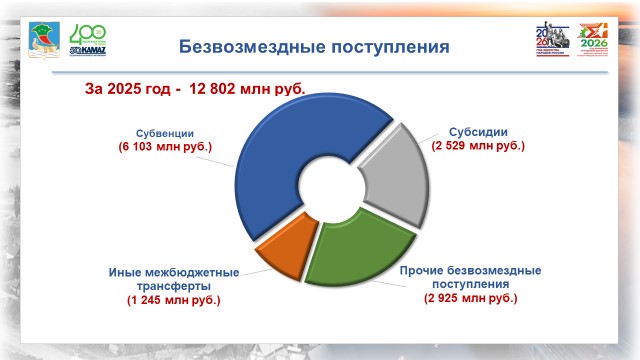Существенный вклад в рост бюджета внесли безвозмездные поступления. В 2025 году в городскую казну поступило 12 млрд 802 млн рублей – на 1 млрд 403 млн рублей больше, чем в 2024 году.