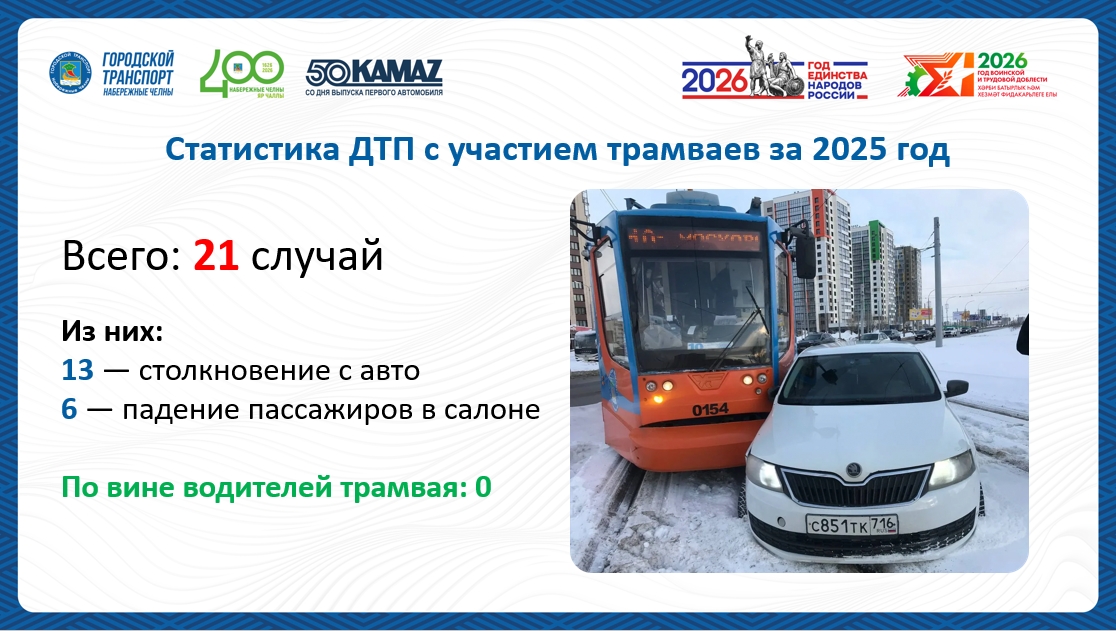 Несмотря на масштабные профилактические меры, статистика аварийности требует пристального внимания. В трамвайном парке за год произошло 21 происшествие, однако ни одно из них не случилось по вине водителей электротранспорта. В автобусном сегменте ситуация сложнее: зарегистрировано 263 инцидента. Основной проблемой остаются падения пассажиров в салоне, которые составляют значительную часть от общего числа происшествий. Также зафиксировано четыре наезда на пешеходов, один из которых, к сожалению, привел к летальному исходу. По каждому факту проводится тщательное служебное расследование с разбором причин.