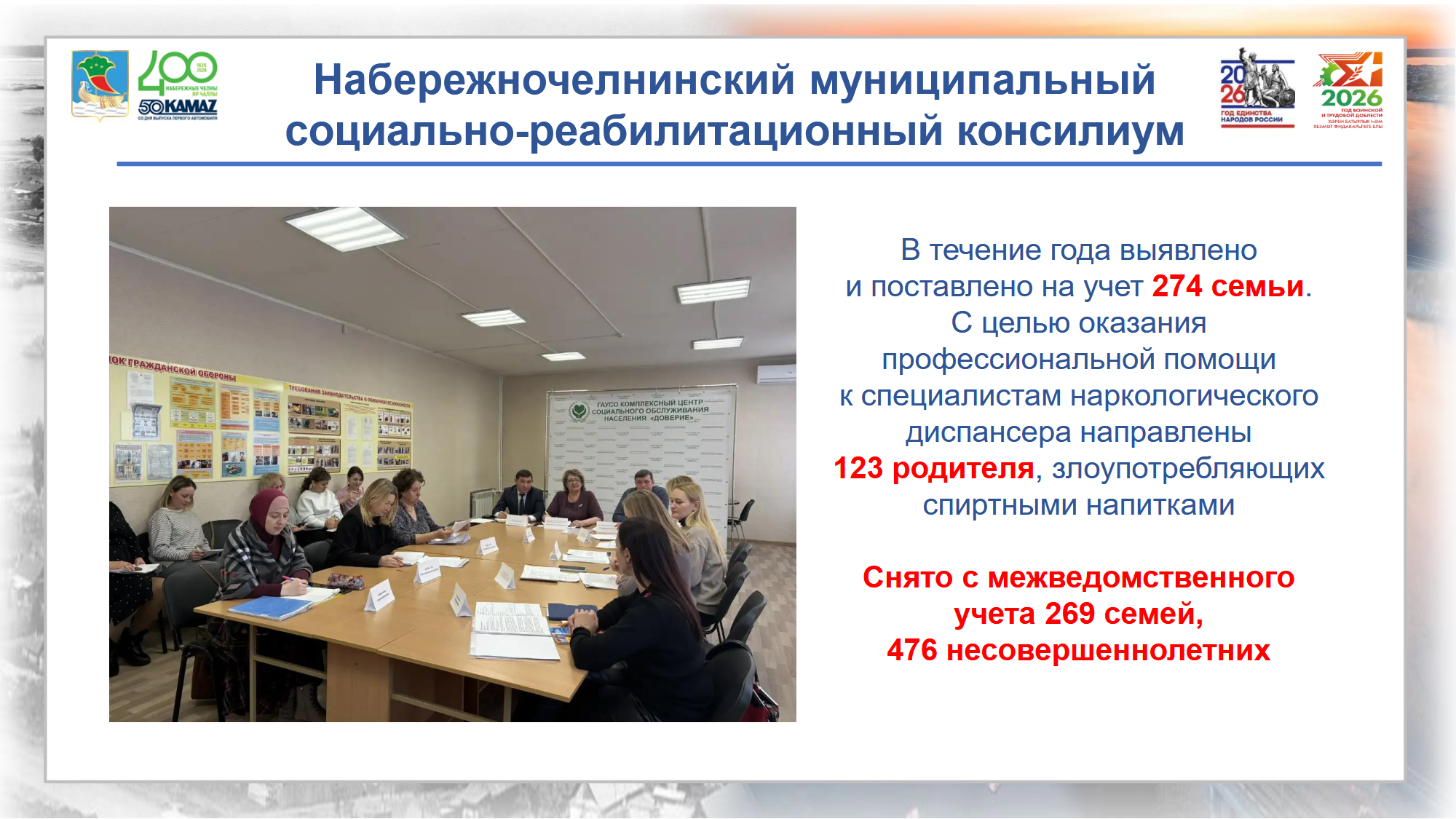 Для помощи семьям, находящимся в социально опасном положении (СОП), в городе действует муниципальный социально-реабилитационный консилиум. В течение года на учет поставили 274 семьи. Основными причинами неблагополучия остаются алкоголизация родителей, правонарушения подростков и пренебрежение нуждами ребенка. Благодаря системной работе, с межведомственного учета было снято 269 семей и 476 несовершеннолетних, а 123 родителя направлены на лечение от алкогольной зависимости.