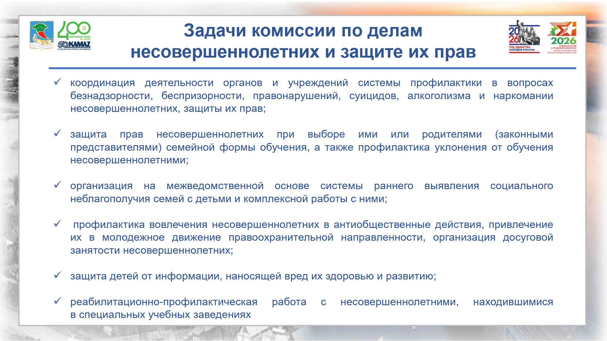 В текущем году Комиссия ставит перед собой задачи по усилению координации всех ведомств в вопросах борьбы с безнадзорностью, суицидами и зависимостями. Приоритетами станут защита прав детей при выборе семейной формы обучения, раннее выявление семейного неблагополучия и реабилитация подростков, вернувшихся из специальных учебных заведений.