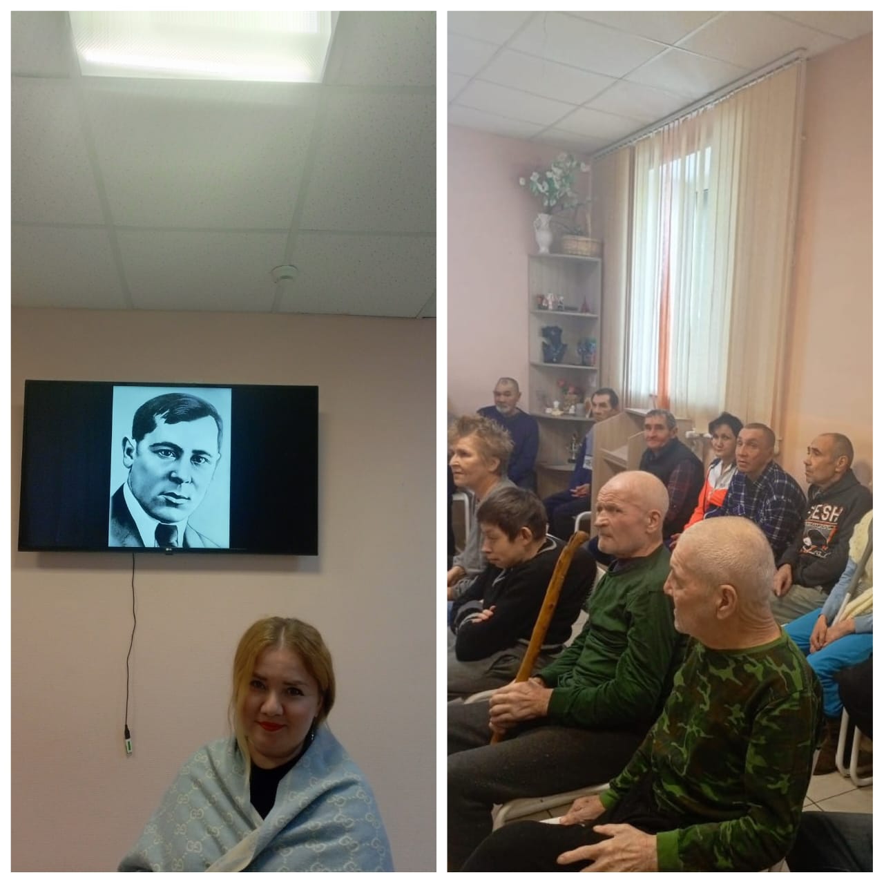 Хезмәт буенча инструктор Альбина Альбертовна социаль хезмәтләрдән файдаланучылар өчен герой-шагыйрь Муса Җәлилнең тууына 120 ел тулу көненә багышланган чара оештырды.