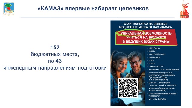 «КАМАЗ» беренче тапкыр техник югару уку йортларына керү өчен квота булдырды. Быел «КАМАЗ» ГАҖ шәһәрнең, республиканың, илебезнең 12 югары ук йортына квота булдырды.