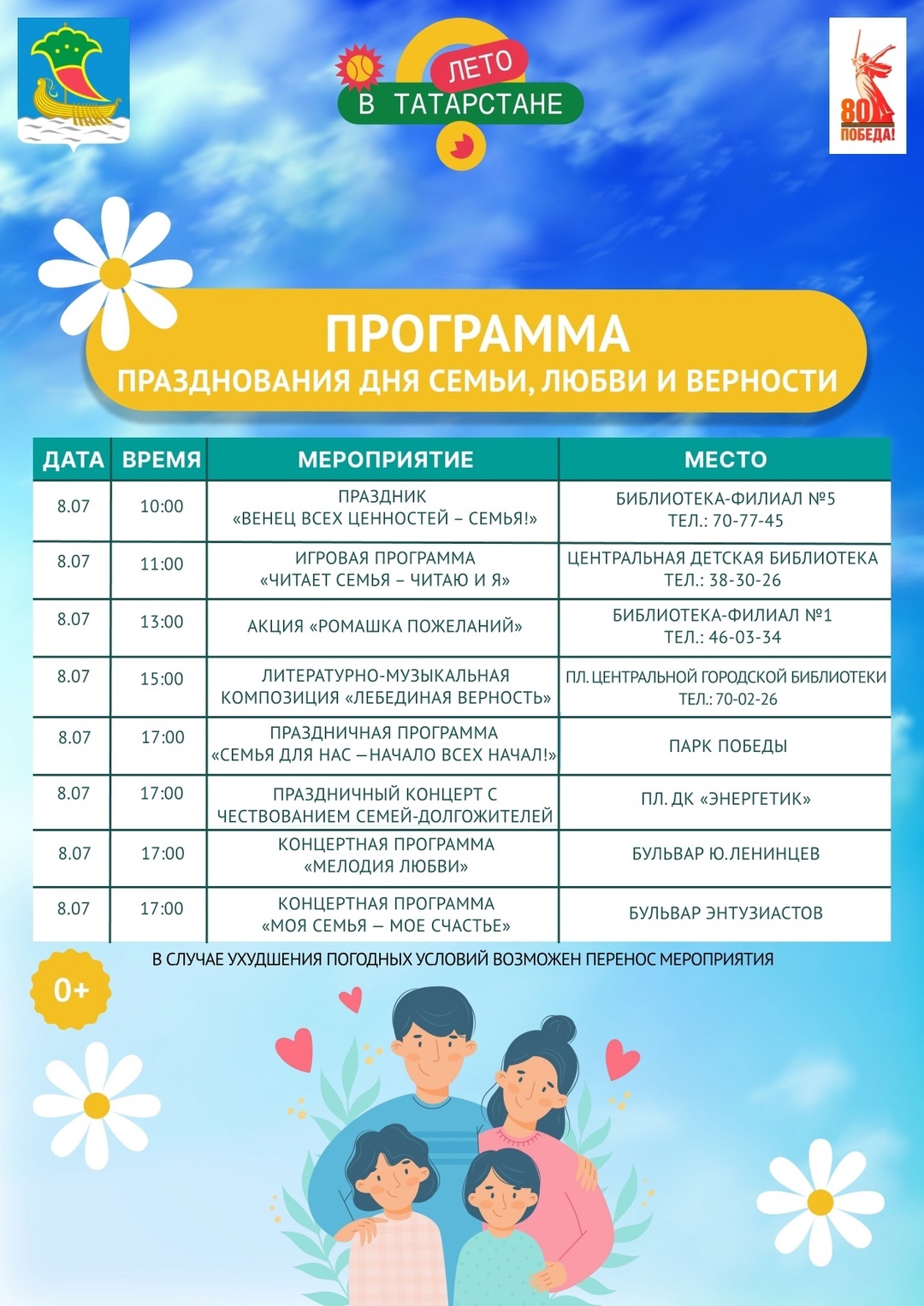 В 11:00 Центральная детская библиотека приглашает на программу «Читает семья – читаю и я» с подвижными играми и викторинами о сказочных семьях и трогательной акцией — написанием пожеланий близким на лепестках ромашки. Эта же акция состоится и в филиале №1. Начало мероприятия в 13:00.