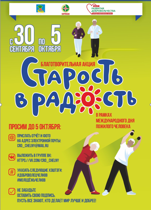 30 сентябрьдән 5 октябрьгә кадәр Яр Чаллыда Халыкара өлкәннәр көне кысаларында «Картлык-шатлык» хәйрия акциясе узачак. Акциядә катнашу өчен бер яки берничә өлкән яшьтәге кешенең өенә барып ярдәм күрсәтергә, азык-төлек сатып алуда ярдәм итәргә яки хәлен белергә бару да җитә.