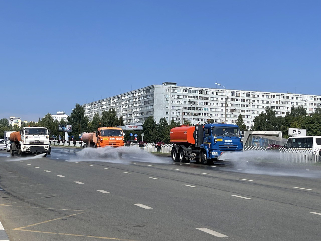 Яр Чаллыда иртәнге 7дән кичке 16 сәгатькә кадәр даими рәвештә юлларга су сибелә. +25˚та асфальтка көн саен су сибү юлны суыту һәм шул рәвешле колея барлыкка килүгә каршы тору өчен оештырыла.
