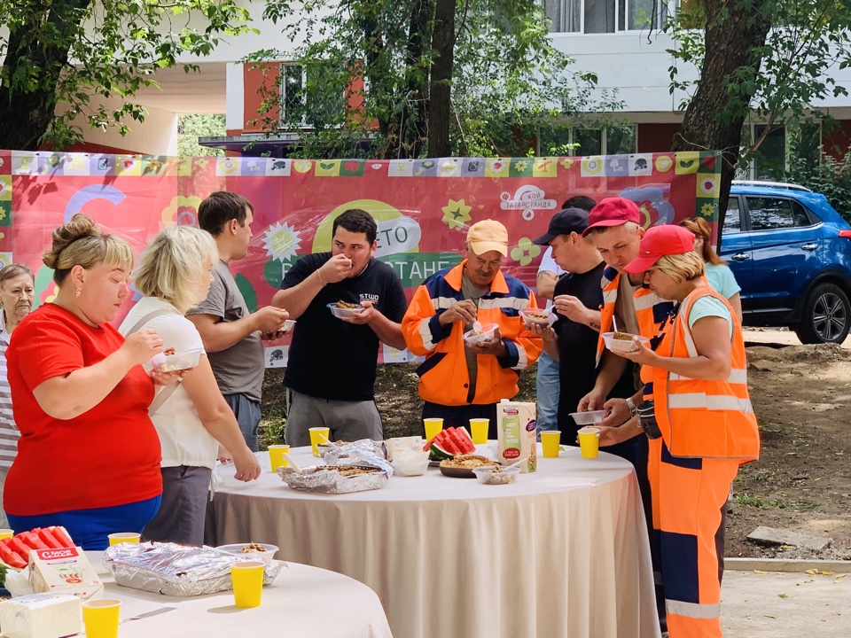 Анда яшәүчеләр юл төзүчеләренә бәйрәм оештырды. Аларны тәмле бәлеш һәм чәй белән сыйладылар.